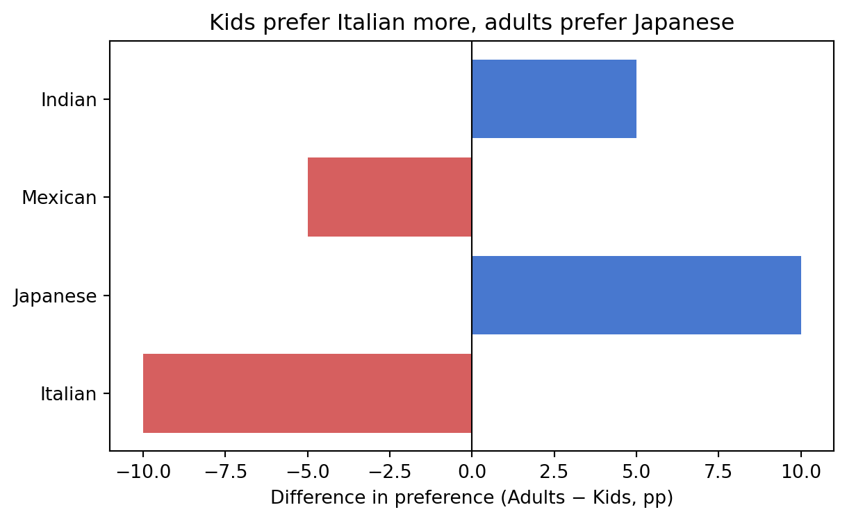 plt.xlabel("Difference in preference (Adults − Kids, pp)")