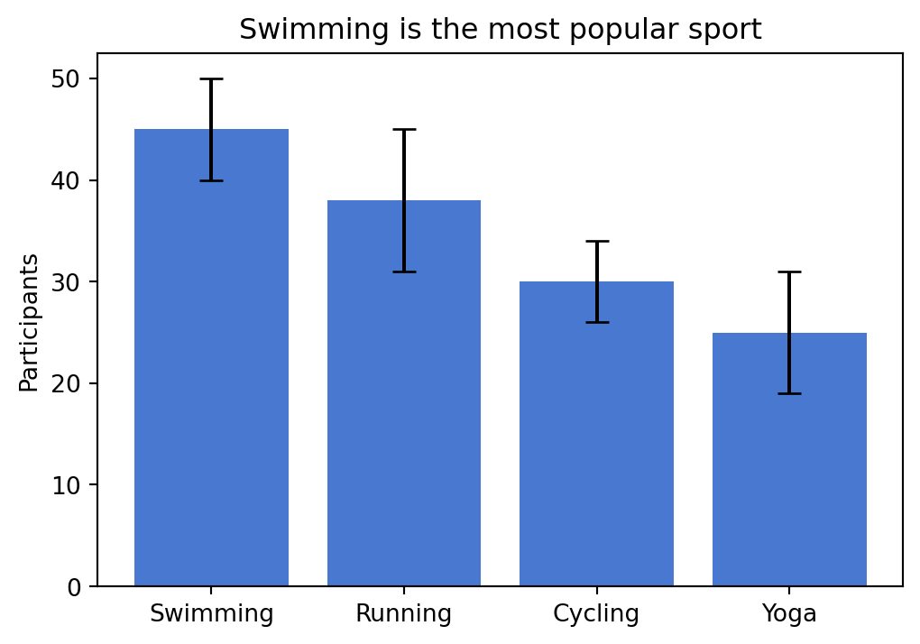 plt.bar(sports, participants, yerr=std_dev, capsize=5, color="#4878cf")