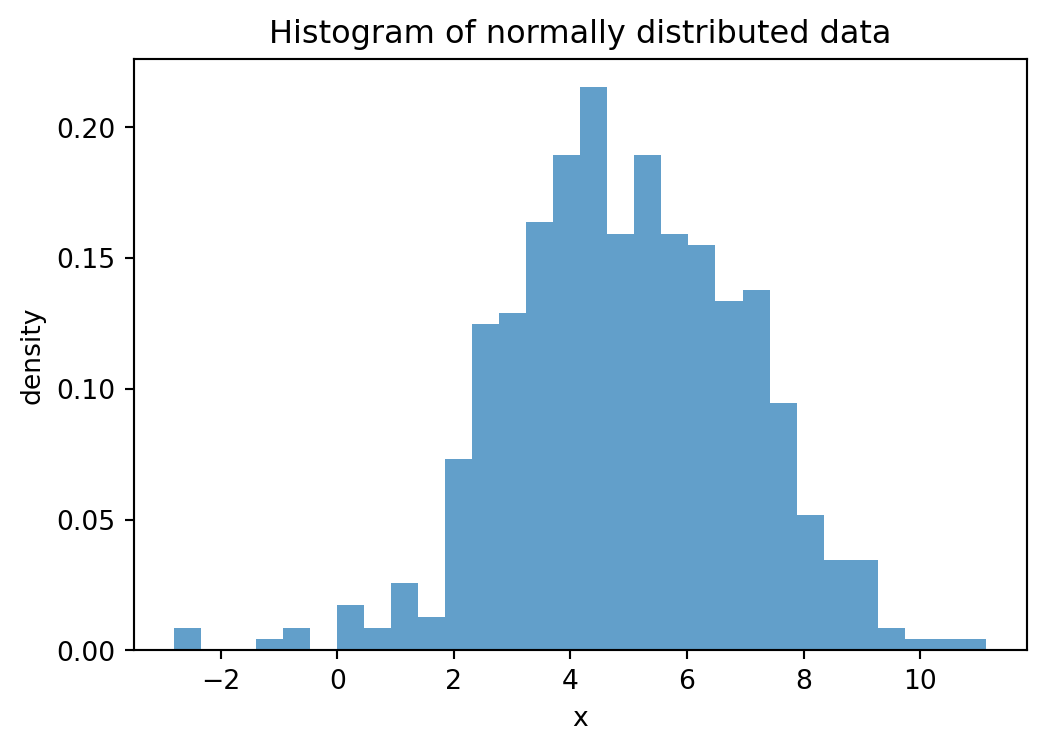 plt.hist(data, bins=..., density=...): histogram. Usedensity=Trueto normalize to a probability density,alpha=...(0 to 1) to make the bars semi-transparent, andrwidth=...(0 to 1) to control the bar width relative to the bin width (default 1.0, i.e. no gaps).