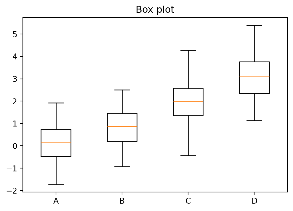 plt.boxplot(data_list, tick_labels=...): box plot. Pass a list of arrays to compare multiple groups, andtick_labelsto label them.