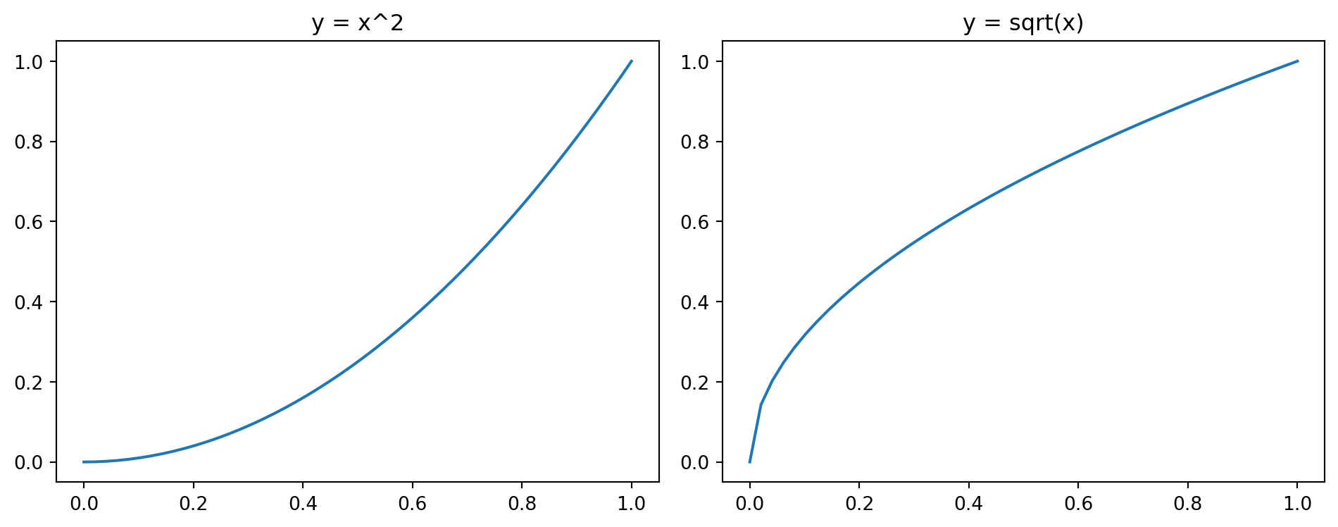 axes[1].plot(np.linspace(0, 1, 50), np.sqrt(np.linspace(0, 1, 50)))