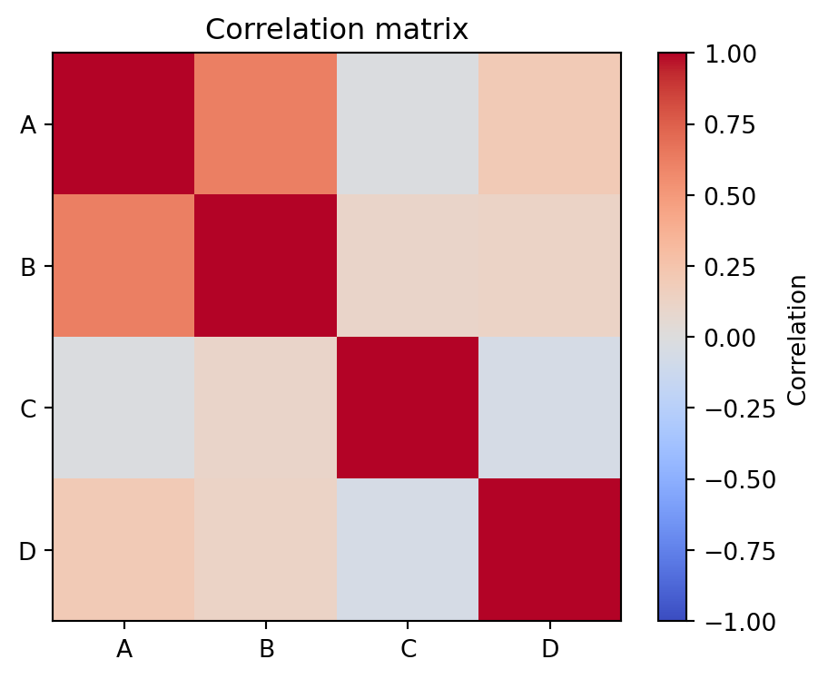 plt.imshow(matrix, cmap=...): display a matrix as a colored grid. Usevmin/vmaxto fix the color range. Common colormaps:"viridis"(default),"coolwarm"(diverging, blue to red),"hot","gray","Blues","RdYlGn".plt.contourf(X, Y, Z, levels=..., cmap=...): draw filled contour lines for valuesZon a grid defined byXandY. Uselevelsto control the number of contour levels.plt.colorbar(label=...): add a color bar to the current plot, with an optional label.np.corrcoef(data, rowvar=False): compute the correlation matrix of the columns ofdata(see Section 9.1 for more on correlation).