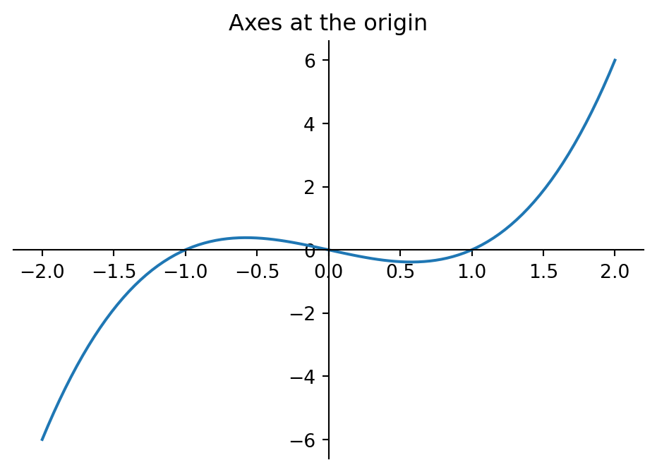 By default, matplotlib draws a rectangular box around the plot. For mathematical function plots, it is often cleaner to place the x- and y-axes at the origin and remove the box. This requires fig, ax = plt.subplots(...) to access the ax.spines object (see also Section 8.8). Each spine is one of the four border lines of the plot area ("left", "right", "top", "bottom").