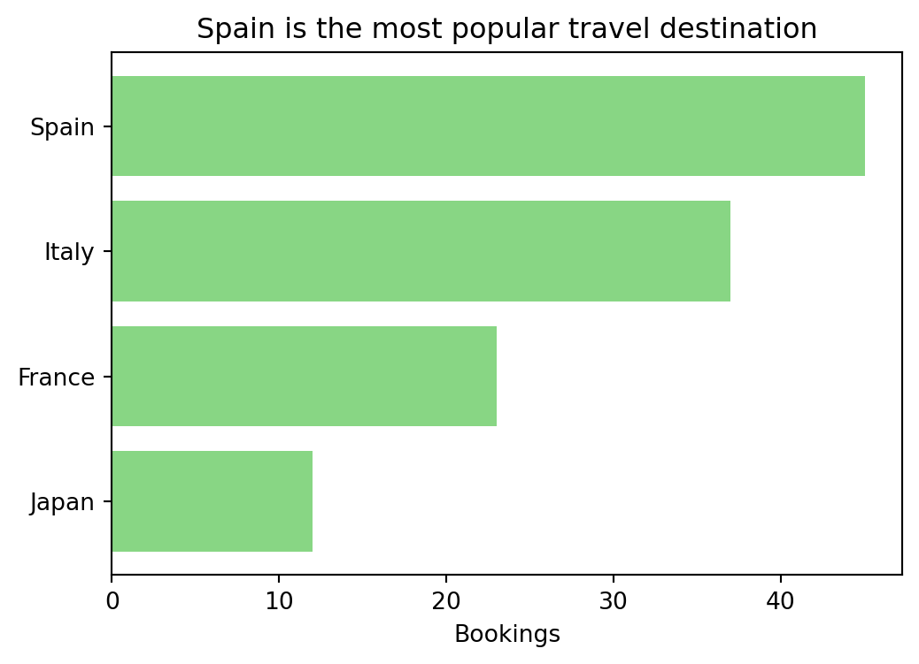 plt.bar(categories, values): vertical bar plot. Usebottom=...to stack bars on top of previous ones,yerr=...to add error bars, andcapsize=...to set the width of the error bar caps. Usecolor=...to set the bar color, andalpha=...(0 to 1) to control its transparency.plt.barh(categories, values): horizontal bar plot.