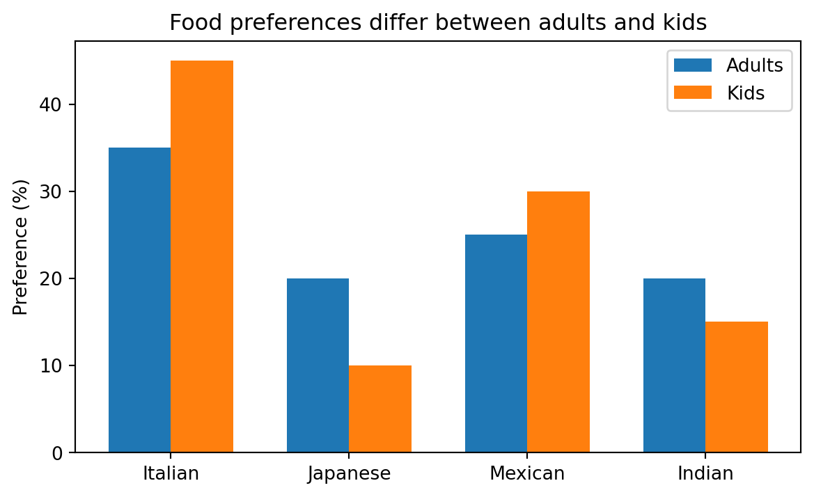 kids_abs = [36, 8, 24, 12] # 80 kids surveyed# grouped bar chart: compare percentages