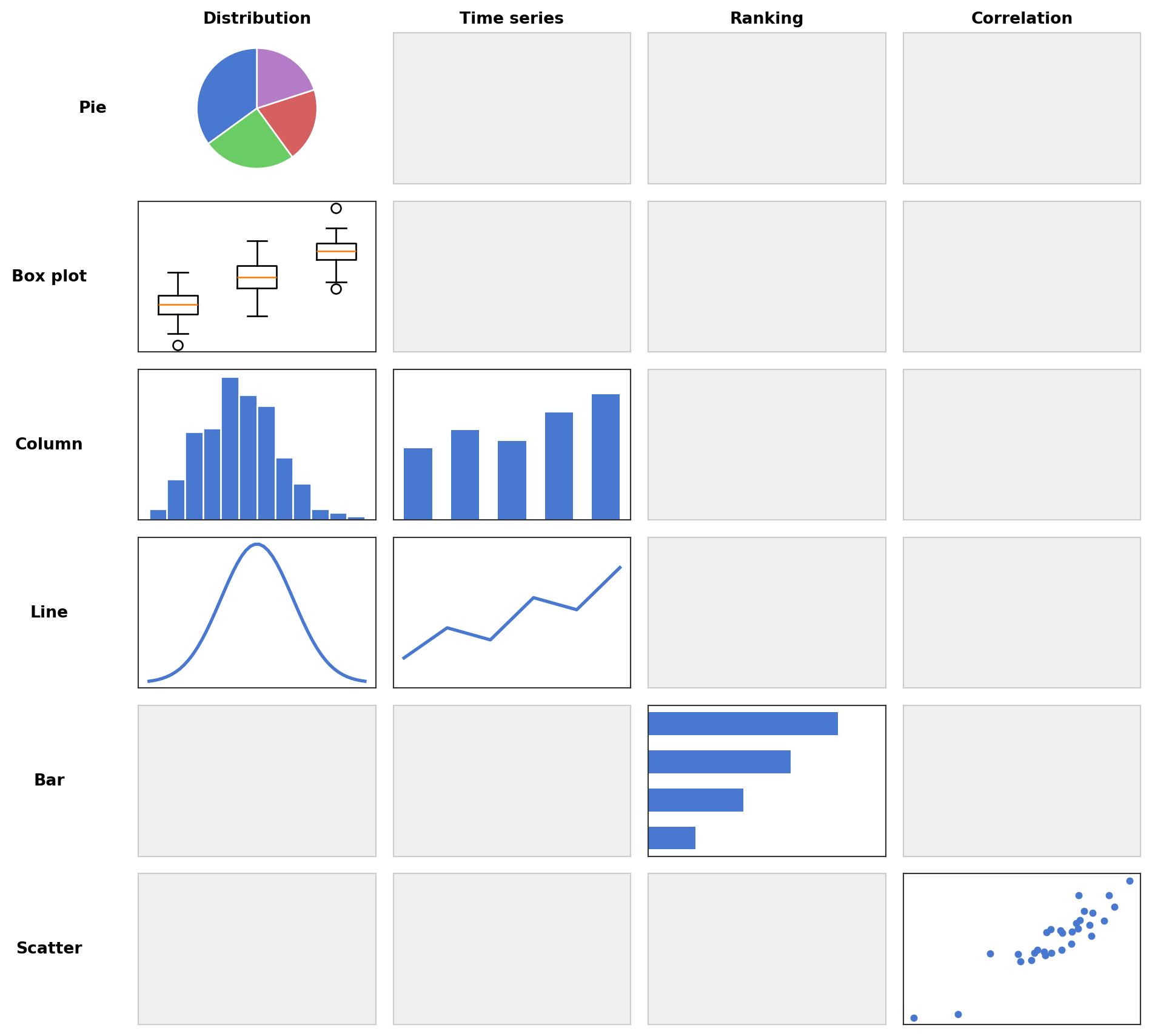 - Box plot: Best for comparing the distribution of multiple groups side by side (medians, quartiles, outliers). For a single distribution, a histogram (which is a column chart of binned data) is more informative. Violin plots are a refined version of box plots that additionally show the shape of the distribution.